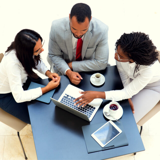 Business team working on laptop during coffee break. Business man and women sitting at table with tablet and cups, using computer and talking. Digital communication concept.